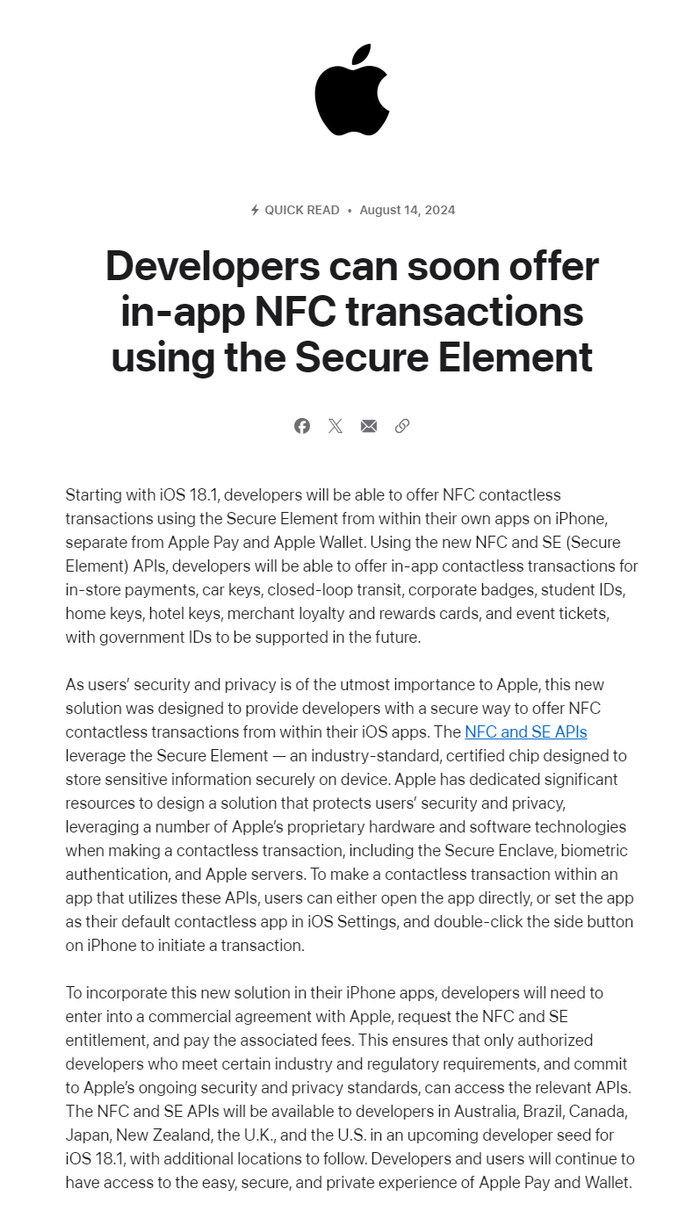 苹果周三宣布,从新版操作系统iOS 18.1开始,开发者将可使用iPhone内的安全元件(SE)在其自行开发的iPhone 应用程序App中,提供NFC无接触数据交换功能,与苹果旗下的Apple Pay和Apple Wallet分开。