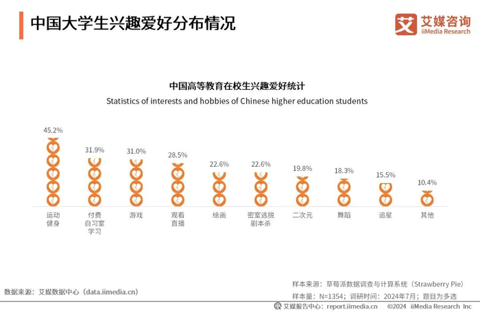 iiMedia Research(艾媒咨询)数据显示,当代大学生兴趣爱好较为广泛。其中,运动健身最受大学生喜爱,占比45.2%。其次是付费自习室学习(31.9%)、游戏(31.0%)和观看直播(28.5%)。此外绘画、密室逃脱、剧本杀、二次元、舞蹈、追星等也是大学生群体中的热门兴趣爱好。艾媒咨询分析师认为,随着社会对健康生活方式的重视,大学生群体也更加注重身体健康,运动健身因此成为首选爱好。这反映了当代青年对自我管理和长期健康的投资意识增强。