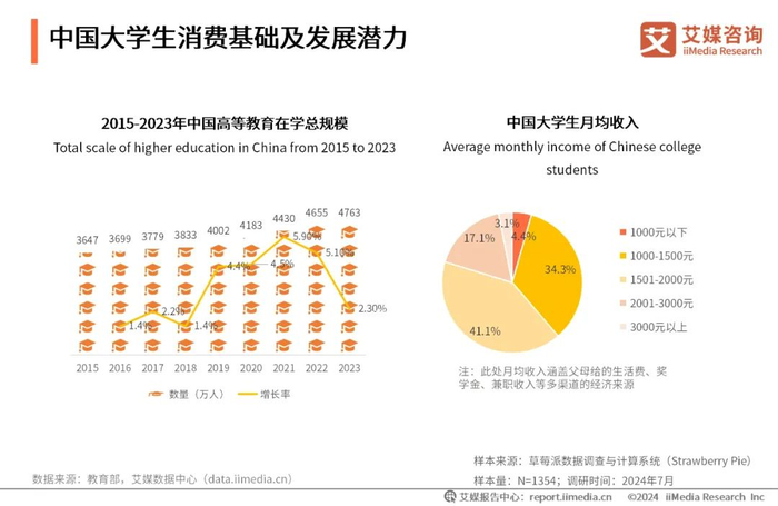 中国在校大学生数量逐年增长。数据显示,中国在校大学生数量呈增长趋势,2023年中国高等教育在学总规模达到4763万人。41.1%的大学生月均收入在1501-2000元,34.3%的大学生月均收入在1000-1500元,预计2024年中国在校大学生的年度消费规模约为8500亿元,消费潜力大。