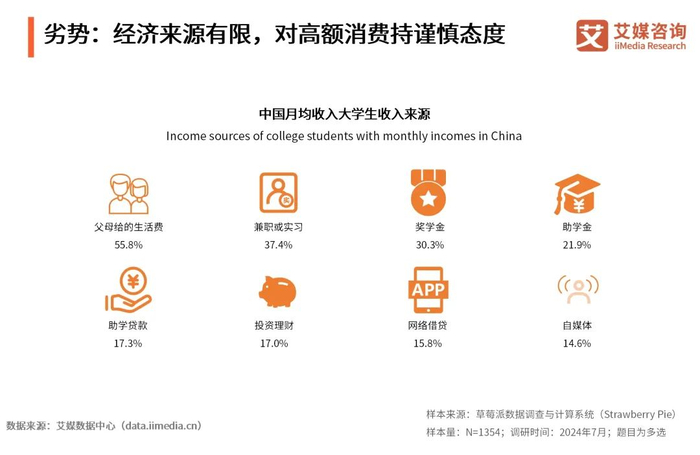 iiMedia Research(艾媒咨询)数据显示,父母给的生活费仍然是多数大学生的收入来源,占比55.8%;其次是兼职或实习及奖学金,分别占比37.4%和30.3%。艾媒咨询分析师认为,大学生群体在经济上并未完全独立,他们在消费时普遍会面临预算限制。对于高额或长期的非必需品消费,他们往往会持较为谨慎的态度。