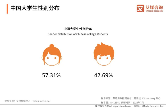 iiMedia Research(艾媒咨询)数据显示,本次调研大学生群体中,女生占比为57.31%,男生占比为42.69%,较为符合中国目前高等教育在校生的性别分布情况。