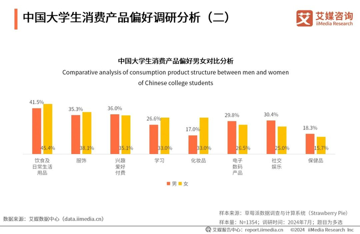 iiMedia Research(艾媒咨询)数据显示,在兴趣爱好消费中,男女生消费习惯差别不大。在饮食及日用品、服饰、学习类消费中,女生群体的消费率要高于男生;在社交娱乐类、数码产品类及保健品消费中,男生消费率要高于女生。在化妆品消费中,男女生消费差异很大,女生消费率几乎是男生的两倍。艾媒咨询分析师认为,性别差异较大的化妆品类应更加注重性别细分。