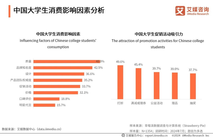 iiMedia Research(艾媒咨询)数据显示,48.0%的受访大学生购物时主要考虑质量,其次是品牌知名度(42.5%)。在促销活动中打折(49.6%)、满减或赠券(45.4%)更能吸引大学生的注意。艾媒咨询分析师认为,中国大学生更倾向于选择那些经久耐用、性能优越的产品。打折等促销活动能够直接降低购物成本,提供额外的价值感,更符合大学生追求经济实惠的消费心理。