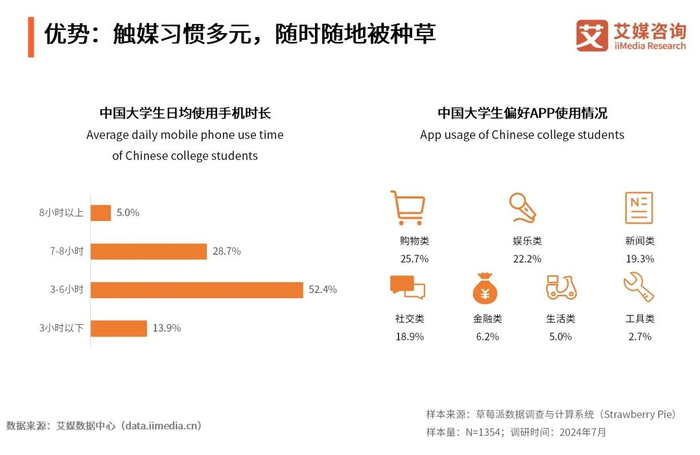 iiMedia Research(艾媒咨询)数据显示,86.1%大学生日均手机使用时长在三小时及以上。他们偏好使用购物类、娱乐类、新闻类及社交类APP,分别占比25.7%、22.2%、19.3%及18.9%。艾媒咨询分析师认为,大学生的日常生活体现出高度数字化的特征,对互联网的深度参与为他们提供了随时随地接入各类信息和服务的能力,使得大学生成为最具潜力和活力的消费主体之一,有利于商家通过多渠道、多形式的营销策略触达目标群体。