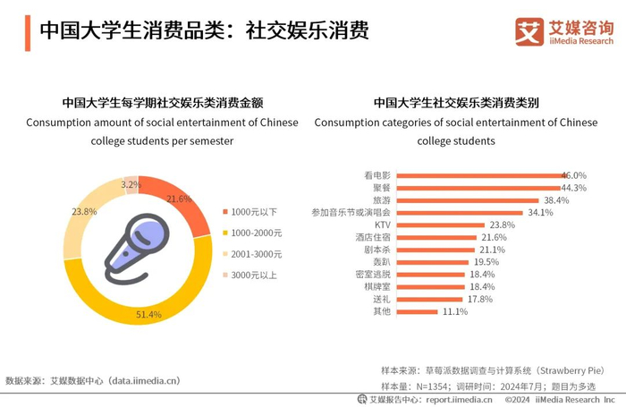 iiMedia Research(艾媒咨询)数据显示,21.6%的大学生每学期在社交娱乐类上的消费金额在1000元以内,51.4%的大学生消费金额在1000-2000元。看电影(46.0%)、聚餐(44.3%)是大学生群体中最常见的社交娱乐方式。艾媒咨询分析师认为,社交娱乐类在大学生群体的非刚需消费中占比较大,细分领域的市场规模也较为可观。