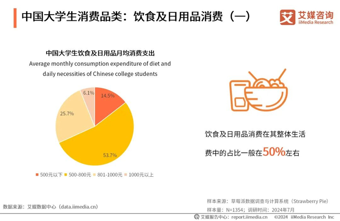 iiMedia Research(艾媒咨询)数据显示,53.7%的大学生平均每个月在饮食及日用品上的消费支出为500-800元,801-1000元的占比为25.7%,而在1000元以上的占比仅为6.1%。饮食及日用品消费是大学生生活的刚需消费,结合大学生月均生活费来看,饮食及日用品消费在其整体生活费中的占比一般在50%左右。