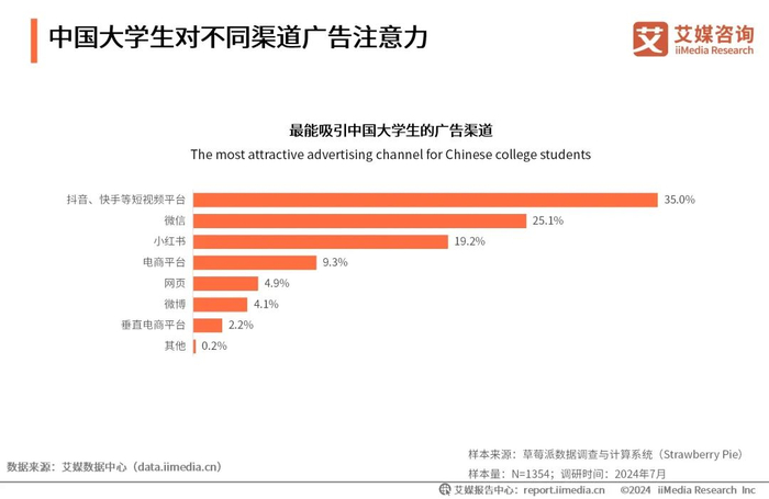 iiMedia Research(艾媒咨询)数据显示,35.0%的大学生表示最能够被抖音等短视频平台的广告所吸引;其次是微信和小红书,占比分别为25.1%和19.2%。而垂直电商平台和网页的广告对大学生的吸引力并不强。艾媒咨询分析师认为,相对于平面图形或者文字,短视频平台以其直观、生动、易于消化的内容形式,高度契合了当代大学生快节奏、碎片化的信息获取习惯。广告主可以充分利用短视频平台的内容特性和强大的算法推荐能力,创作富有创意、内容精炼且与目标受众兴趣点相契合的广告视频,以提升广告的曝光率和转化率。