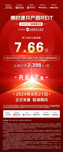 8月14日,博时基金发布公告,天津首单公募REIT——博时津开科工产业园REIT(简称“博时津开产园REIT”,基金代码:508022)将于8月21日至8月23日在上海证券交易所正式发售,认购价格为2.398元/份,拟募集资金总额11.99亿元。其中,面向公众发售4500万份,公众投资者可以通过场内证券经营机构或基金管理人及其委托的场外基金销售机构认购基金份额,最低认购金额为1000元。目前,博时津开产园REIT网下询价全部有效认购数量总和为初始网下发售份额的7.66倍,创今年以来产权类公募REIT网下询价认购倍数新高[1]。