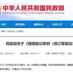 据民政部网站消息,民政部起草的《婚姻登记条例(修订草案征求意见稿)》,正在征求社会各界意见。