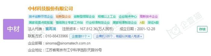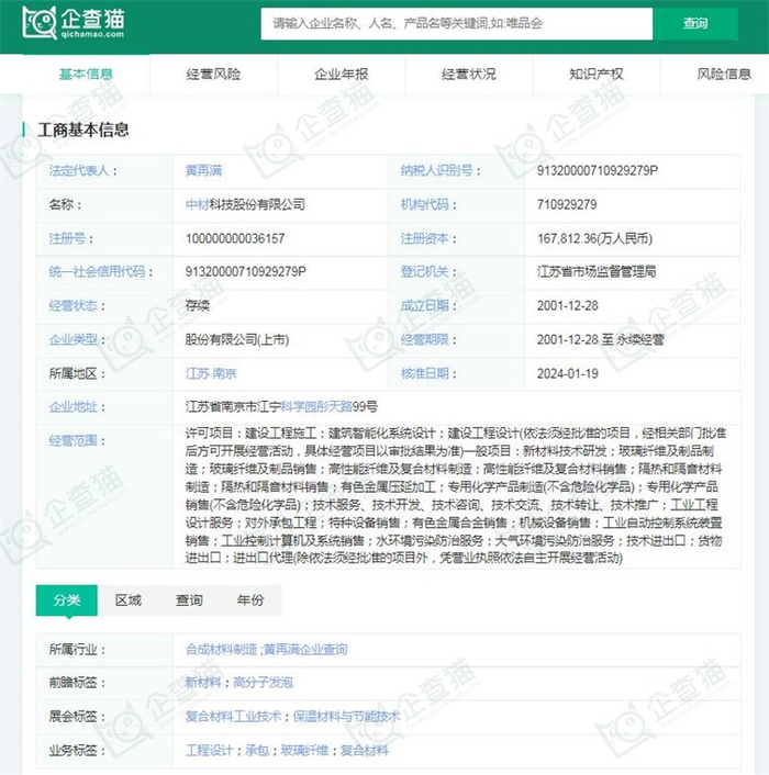据企查猫显示,中材科技股份有限公司成立于2001年12月28日,注册资本167,812.36万人民币,法定代表人黄再满,公司经营范围包括:许可项目:建设工程施工;建筑智能化系统设计;建设工程设计(依法须经批准的项目,经相关部门批准后方可开展经营活动,具体经营项目以审批结果为准)一般项目:新材料技术研发;玻璃纤维及制品制造;玻璃纤维及制品销售;高性能纤维及复合材料制造;高性能纤维及复合材料销售等。