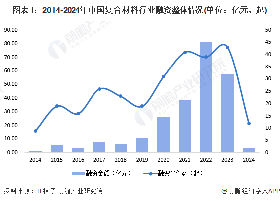 投融资方面,根据IT桔子的统计数据,中国复合材料行业的融资事件和数量规模呈波动上涨趋势,当前正处于行业投融资的活跃阶段,其中行业投融资金额规模的峰值出现于2022年,达81.67亿元;投融资事件数量规模峰值位于2023年,为43起。