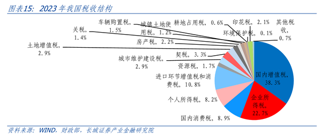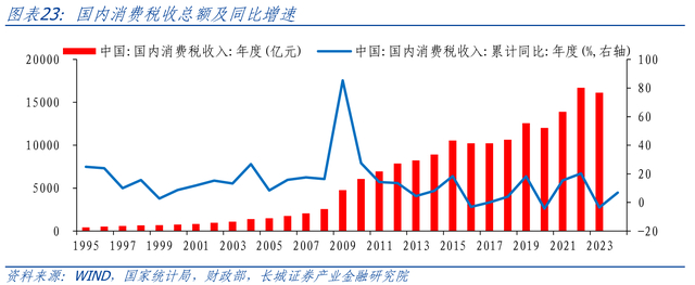 增量一是来自国内烟酒、成品油、汽车等产量销量增长带动消费税收总量增长。2009年成品油消费税改革落地、2014年新一轮消费税改革启动,2009-2014年、2014-2019年和2019-2023年国内消费税收复合年均增速分别为13.4%、7.1%和6.4%,2024年上半年我国消费税收同比增长6.8%,略高于过去四年的平均水平。