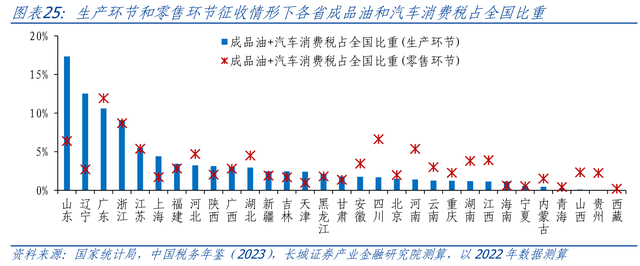 成品油消费税占总体消费税的接近四成,可能进一步将征收环节后移至批发或零售环节,并改为价外征收。若进一步推动央地分成或划转地方,一方面或能明显缓解地方财政收支压力,另一方面有助于提高地方对成品油市场监管的积极性,减少税源流失。由价内改为价外征收,相当于把“隐性”税收转为“显性”税收,也有利于消费者更直观地感受到消费税调节导向与约束作用。