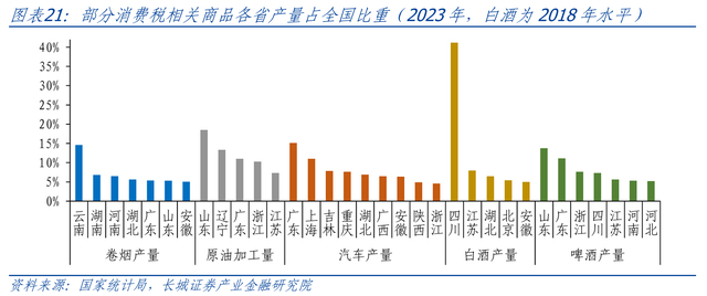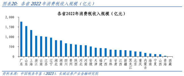 从地区分布来看,随着征收环节后移,消费税收入可能更多向人口、消费大省倾斜。我们大致以卷烟、白酒、啤酒产量各省占全国比重大致推算生产环节征收情况下烟、酒消费税各省占全国比重,以各省食品烟酒消费支出占全国比重大致推算零售环节征收情况下烟、酒消费税各省占全国比重,广东、江苏、浙江等人口较多、食品烟酒支出较高省份烟酒消费税收可能增多,而云南、湖南、贵州等生产大省,由于人口相对较少,食品烟酒人均支出相对较低,烟酒消费税收可能减少。类似的,成品油和汽车消费税收可能也会更多流向广东、浙江、四川等省份,而生产大省如山东、辽宁、上海等生产大省油、汽车税收可能减少。