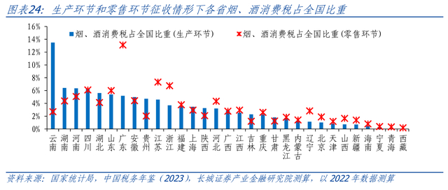 烟、酒消费税占比接近六成,但作为限制性消费品,税收完全归属地方可能反而不利于抑制相关消费;并且考虑到烟酒销售渠道庞杂,价格体系复杂,若后移至零售环节,征收难度较大,因而或可先探索央地分成。