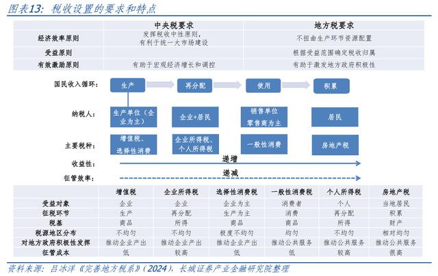 进一步完善地方税系,无疑是目前地方政府收入占比下降、化债任务较重背景下,一个较好的突破点。实际上税收伴随着整个经济循环的生产、分配、使用和积累的各个环节,需要平衡经济循环中的经济效率、居民/企业/集体/个人的受益原则、以及中央/地方政府的宏观调控和有效激励。因此增值税、选择性消费税等税源地域分布不均匀的税种,可能更加适合中央收税或央地分成。而一般性消费税房产税等,税源分布相对均匀或直接针对属地居民的税收,一定程度可以推动当地政府提高消费、居住环境等公共服务水平,可能更加适合设置为地方税。