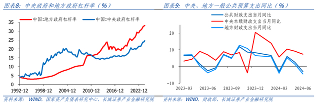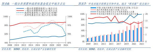 弥补地方财政收支缺口,一则需要中央对地方转移支付和税收返还,二则需要地方政府发行专项债等进行筹资。但要看到中央向地方转移支付能力受自身收入所限,无法覆盖地方财政收支缺口的增长。2017年后中央转移支付占中央两本账收入比重明显增加,2022年上升至98%,明显高于2013-2017年平均68%的水平。2017年后转移支付占地方财政收支缺口的比重出现明显下滑,表明仅靠中央转移支付尚不足以支撑地方财政支出。也是在这一时期地方政府专项债发行量开始明显增长,从2018年新增1.32万亿元,到2023年新增3.96万亿元。而地方政府和中央政府杠杆率分别从2018年初的19.5%和15.8%上升至2023年末的32.3%和23.8%,地方政府债务压力比中央政府增长更快。