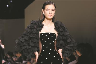 DIOR展示了充满垂坠感的梭织上衣与长裙款式,挺括的丝织物宛如湖面浮现的涟漪一般,使得平平无奇的一片米白色布料变得神奇又生动;而Giorgio Armani Prive的亮银色裤装、迷你晚装包以及黑灰混色泡泡袖披肩上衣、棉麻毛等交织织物在无数个小面积立体设计当中拼组成华丽且浪漫的礼服;香奈儿模特身穿的极简圆形立领梭织上衣,更是将丝织物基因中的细腻柔软植入,体感舒适也不失精致。
