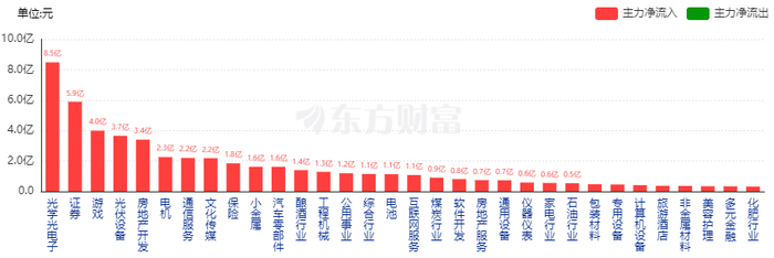 从东财统计的今日早盘行业资金流向看,光学光电子行业获得主力资金买入第一,其次是证券行业和游戏行业。