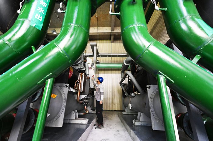 8月5日,杭州医药港小镇1号能源站内,工作人员查看电制冷机等设备。近日,浙江杭州高温天持续,在钱塘区的杭州医药港小镇,多个能源站制冷主机等设备组成的超级“中央空调”,将冷水通过管道源源不断输送到园区的企业楼宇建筑物内,降低企业生产空间环境温度,实现“集中供冷”。