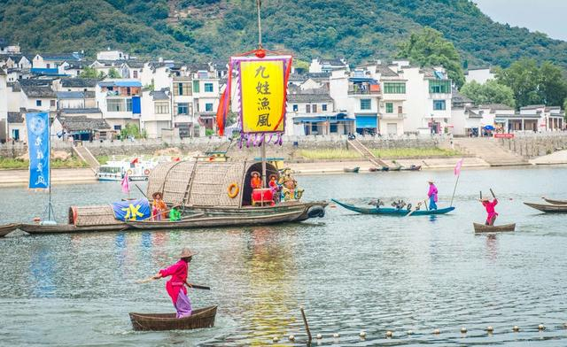 两岸村民在新安江山水画廊风景区表演节目“九姓捕鱼”。