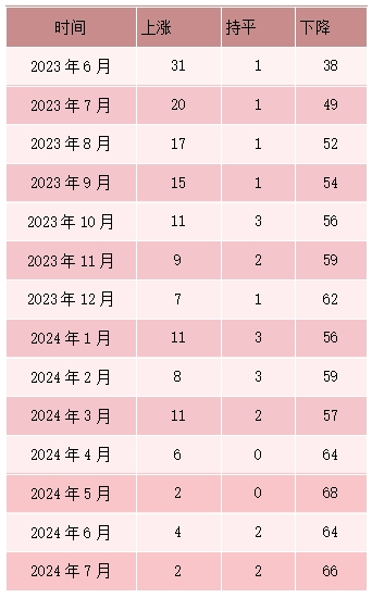 从房价涨跌城市数量来看,7月份,70个大中城市中,新建商品住宅和二手住宅销售价格环比下降城市分别有66个和67个,分别比上月增加2个和1个。