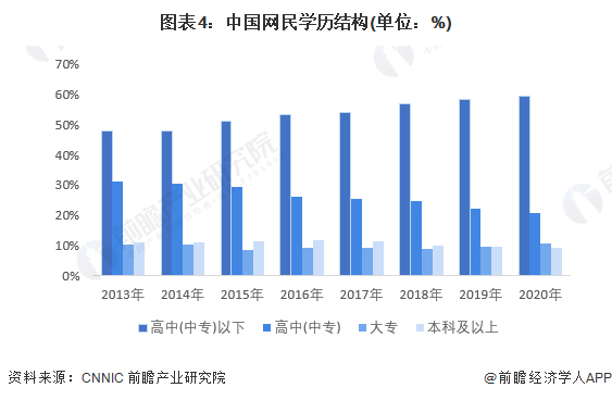4、网络直播的网民群体,高中(中专)以下学历占比平稳增加,高中(中专)学历占比缓慢减少