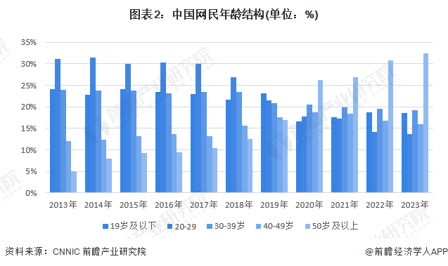 中国网络直播用户的年龄结构展示出多样化的趋势。2013年,20~29岁网络用户占比31.2%,是网络用户中年龄段最多的群体,50岁以上的网民仅有7.9%,占比最少。但到2023年中国网民年龄结构发生巨大反转,50岁及以上的用户比例显著上升至32.5%,一跃成为网络用户中最大的年龄群体,甚至远远超过占比19.2%、排名第二的30~39岁网民数量,而,20~29岁网络用户占比下降到13.7%,是网民中数量最少的群体。这反映出网络直播不再仅仅是年轻人的专属娱乐方式,随着网络技术的进步、互联网的普及、和人们观念的转变,中老年用户也逐渐加入到网络直播的行列中,体现出这一市场的广泛吸引力和潜在增长空间。