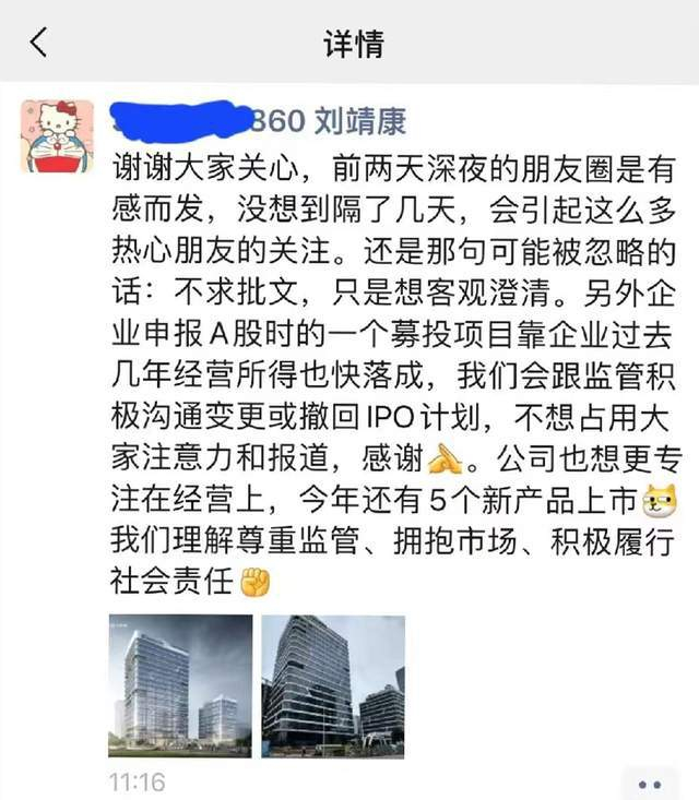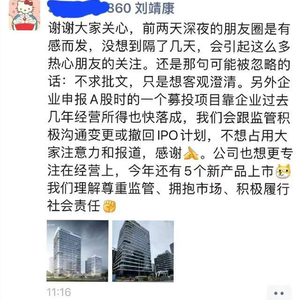 此前,刘靖康在朋友圈发布长文,就公司IPO进程中遇到的问题进行了澄清,称“如有不符合事实的,自愿辞职”,他还表示:“我不求批文,仅求公道定性;别让真正想通过科技让全世界认识到中国智造和科技崛起的 2000个90后伤了心。”