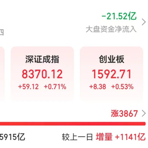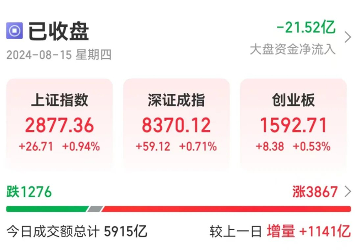 从盘面看,今天A股低开高走。截至收盘,沪指涨0.94%,深证成指涨0.71%,创业板指涨0.53%。从题材板块来看,AI眼镜板块持续爆发,游戏股走强,影视股反弹,旅游股午后拉升,民爆概念股调整。全市场超3800只个股上涨。沪深两市今日成交额5915亿元,较上个交易日放量1141亿元。