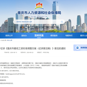 根据《中华人民共和国劳动法》《最低工资规定》(原劳动部令第21号)《重庆市最低工资保障规定》(重庆市人民政府令第106号)和《关于进一步做好最低工资标准调整工作的通知》(人社部发〔2015〕114号),我局研究起草了《重庆市最低工资标准调整方案(征求意见稿)》,现向社会公开征求意见。公众可以通过以下途径和方式提出意见。
