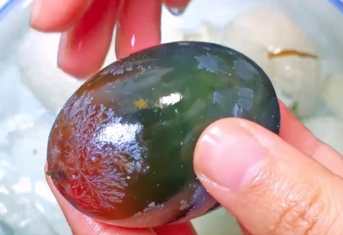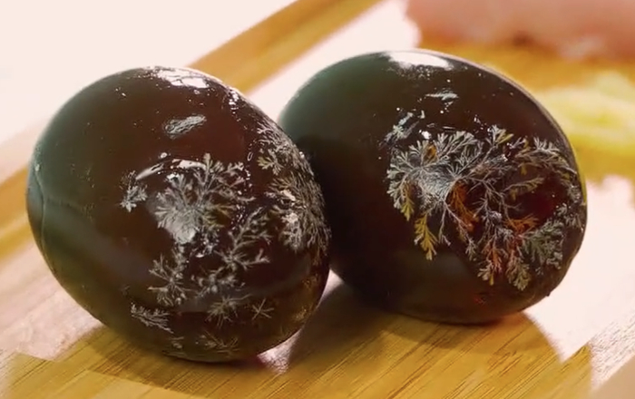皮蛋的黑,一方面是在碱性的腌制条件下,鲜蛋中部分蛋白质会水解成氨基酸,与蛋液中葡萄糖缓慢发生美拉德反应;另一方面,蛋内金属离子与含有巯基及二硫键的胱氨酸和半胱氨酸不断络合,双重因素影响了松花蛋的颜色。此外,腌制过程中的硫化氢气体,会与蛋清和蛋黄中的矿物质作用生成各种硫化物(如硫化亚铁、硫化铜、硫化锌等),也可能影响蛋清和蛋黄的颜色,导致蛋清呈特殊的茶褐色、蛋黄则呈墨绿色。