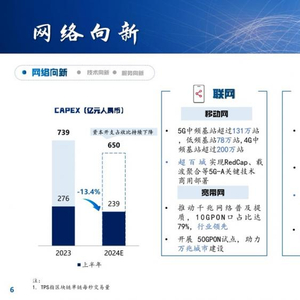 对于2024年全年的资本开支指引,中国联通董事长在业界说明会上表示,中国联通着力强化网业协同,精准投入,资本支出实现有效控制,上半年资本支出为人民币239亿元,同比下降13.4%。资本结构持续优化,带息债务较去年底下降3.8%至人民币30亿元,资产负债率下降至44.9%的健康水平。