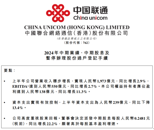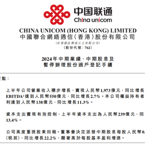 中国联通2024年中财报:总营收1973亿元,净利润连续8年双位数增长