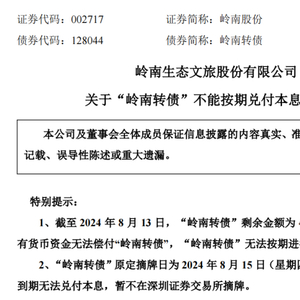 此前8月7日,岭南股份称因现有货币资金无法覆盖本息,岭南转债存在重大兑付风险。公告发出后,岭南股份当日则遭遇股债“双杀”,正股和岭南转债双双跌停;8月8日,岭南股份股价再度跌停,报收1.01元/股;岭南转债大跌近20%报60.125元/张。