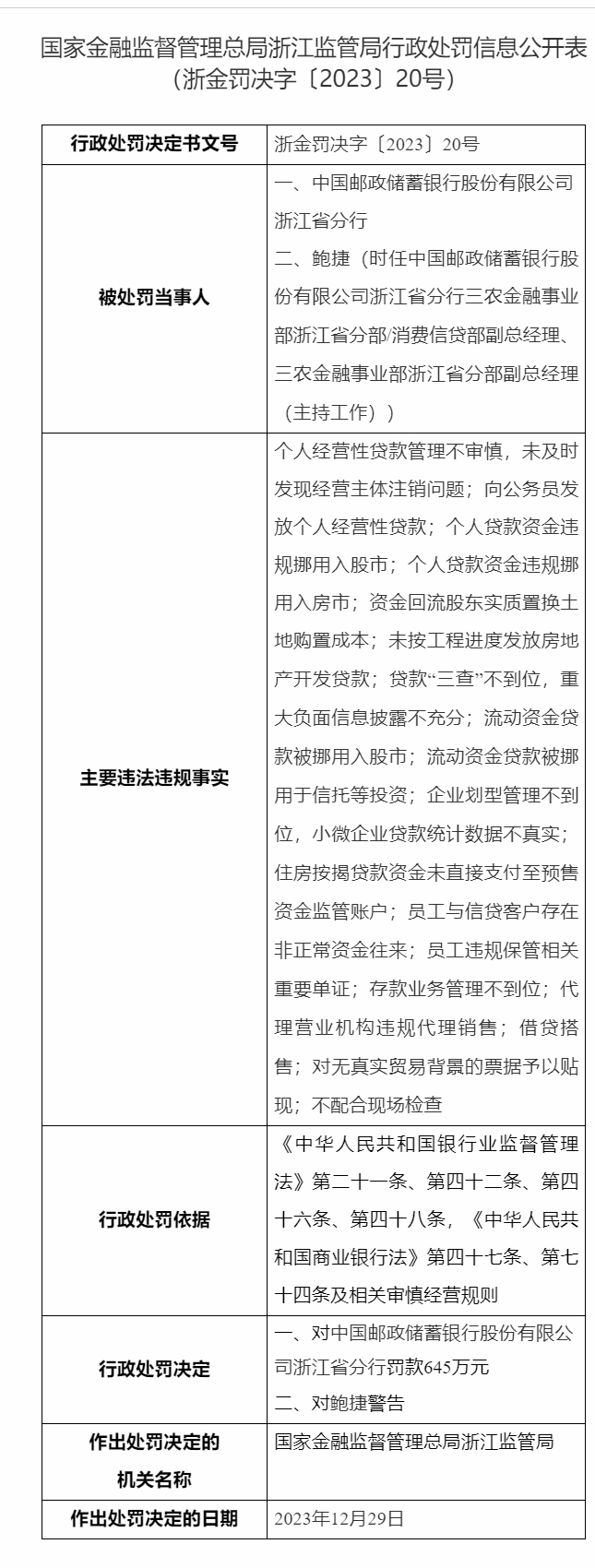值得注意的是,同样是邮蓄银行浙江省分行,今年1月9日(以罚单公布时间为准),因“个人经营性贷款管理不审慎,未及时发现经营主体注销问题;向公务员发放个人经营性贷款;个人贷款资金违规挪用入股市;个人贷款资金违规挪用入房市;住房按揭贷款资金未直接支付至预售资金监管账户”等11项违法违规行为,该分行被国家金融监督管理总局浙江监管局罚款645万元。