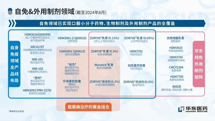 由于上述部分外用制剂同样覆盖自身免疫适应症,可以与华东医药自免产品形成协同效应,尤其是在银屑病治疗领域对银屑病,公司目前已布局生物制剂乌司奴单抗注射液、口服小分子药物环孢素软胶囊、单方外用制剂ZORYVE®乳膏和ARQ-154(罗氟司特泡沫剂)以及复方外用制剂Wynzora®乳膏,有望为儿童及成人银屑病患者带来更多用药选择,形成银屑病治疗黄金组合实现全周期全人群覆盖。其中华东医药与荃信生物合作的乌司奴单抗注射液有望于年内获批。