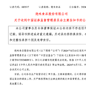 8月15日,绝味食品股份有限公司(以下简称“绝味食品”)发布公告称,公司于当日收到中国证监会下发的《立案告知书》。因公司涉嫌信息披露违法违规,根据《中华人民共和国证券法》《中华人民共和国行政处罚法》等法律法规,2024年6月7日,中国证监会决定对公司立案。