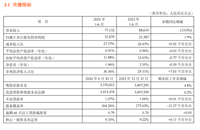 平安银行今年上半年关键财务指标