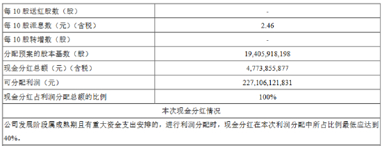 该行2024年中期利润分配每10股派发现金股利2.46元(含税),现金分红总额(含税)约为47.74亿元。
