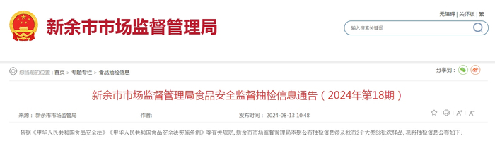 新余市市场监督管理局食品安全监督抽检信息通告(2024年第18期)