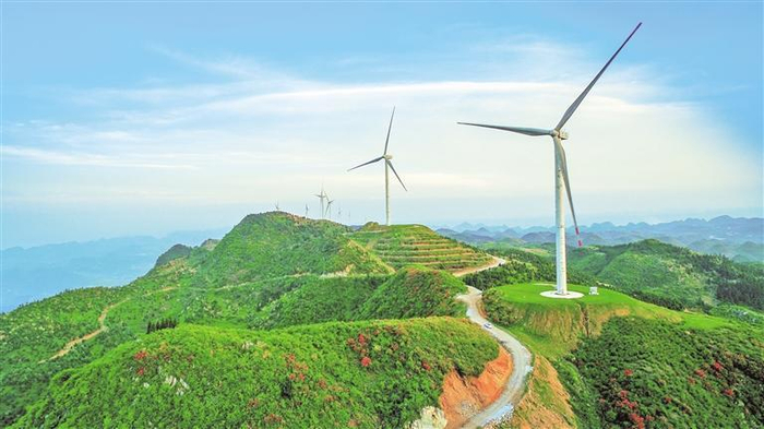在关岭自治县永宁风力发电场上,一根根巨型“三叶草”迎风飞转,115米的超大风轮源源不断地将大自然的能量转化为绿色清洁的电能并输送到千家万户。