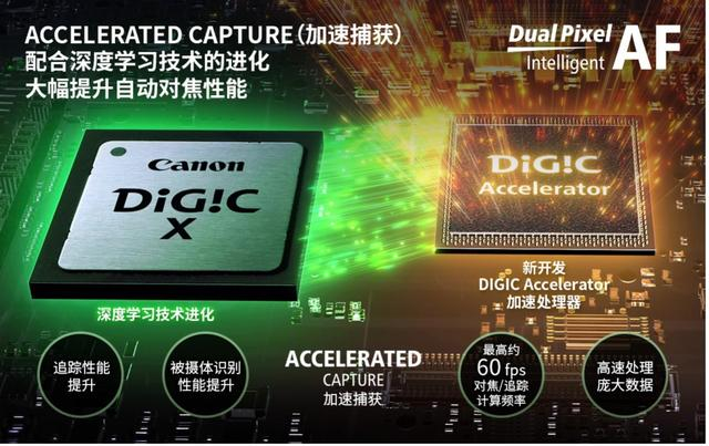 这台相机采用了DIGIC X + Accelerator 双处理器,其中Accelerator处理器的英文简单来说就是:加速。这个处理器带来了更强大的运算效率,大幅提升了对于对焦主体识别、跟踪的速度与稳定性。