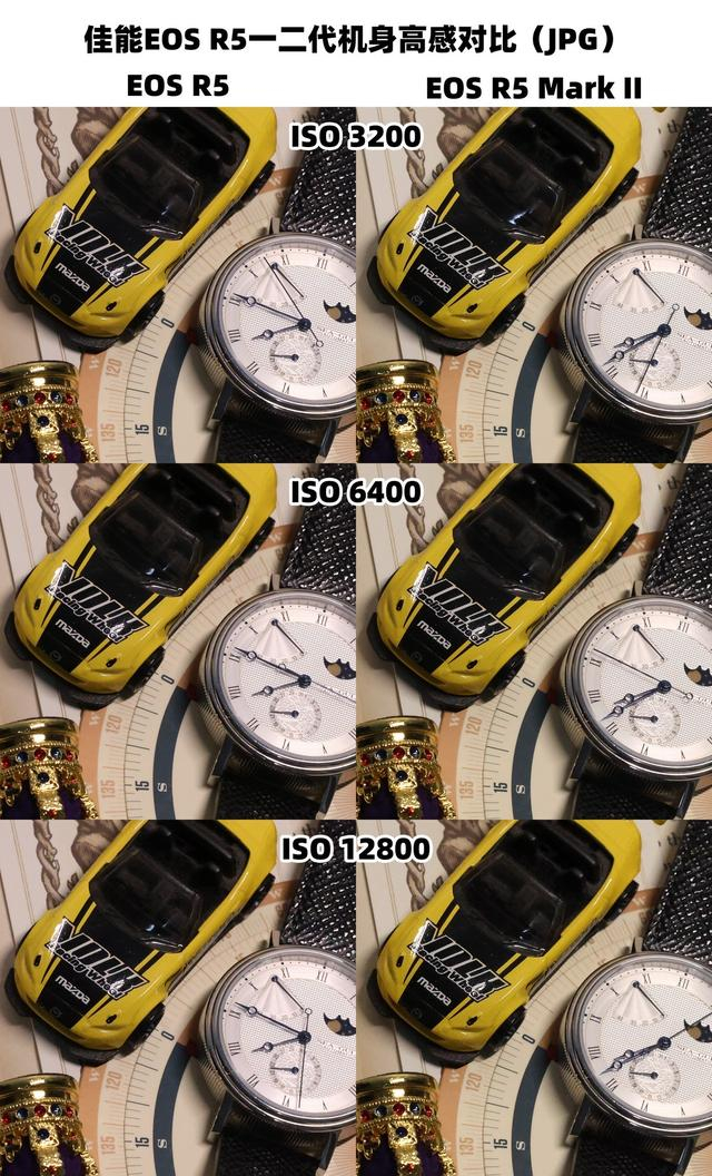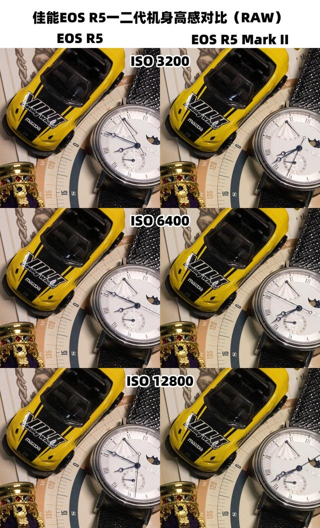 我们可以来对比下佳能EOS R5一代与二代机身的高感表现,这里为大家呈现了ISO 3200、6400和12800三档常用感光度下的RAW与JPG格式对比。可以看到两台相机在高感上的表现是比较接近的,对于实际拍摄来说如果我们使用肉眼分辨,很难看出两台相机高感下的差别。