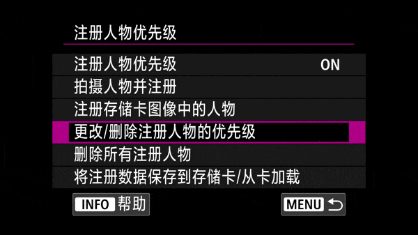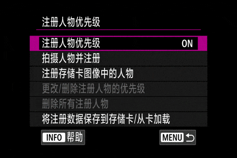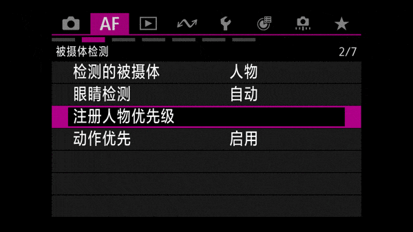 使用注册人物优先,我们可以通过机身直接拍摄,或者使用存储卡照片获取注册人物信息。相机可以同时记录10个人物为一组信息,并且可以以注册人物组的形式将注册信息保存于存储卡,存储卡最多可以记录10组信息。因此如果用于体育拍摄,相机最多可以记录100个注册人物。