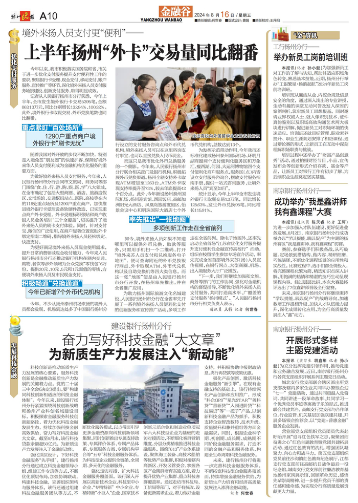 未来,建行扬州分行将进一步完善科技金融服务体系,不断拓宽科技型企业服务覆盖面,持续增强金融服务供给,为新质生产力培育和经济高质量发展注入澎湃金融动能。