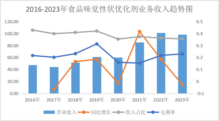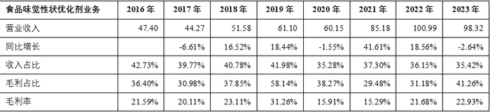 食品味觉性状优化剂:谷氨酸、谷氨酸钠、呈味核苷酸二钠、肌苷酸二钠、食品级黄原胶、海藻糖、纳他霉素等。从2016年到2023年,食品味觉性状优化剂收入从47.4亿元增长1.07倍至98.31亿元,CAGR为11%。营业收入也是呈现周期性波动,2021年和2022年收入增长达到一个小高峰。其收入占比虽不及动物营养氨基酸业务,但其毛利占比已经超过它,成为毛利占比第一。主要是因为其毛利率高于动物营养氨基酸,并且2023年呈现增长。详见下表、图。