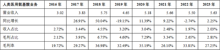 人类医用氨基酸:谷氨酰胺、脯氨酸、亮氨酸、异亮氨酸、医药级缬氨酸、肌苷、鸟苷、腺苷、普鲁兰多糖等。目前销售规模相对较小,其业绩表现详见下表。