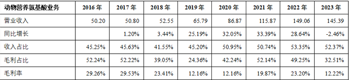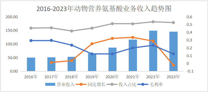 氨基酸行业受市场周期波动影响较大,从梅花生物2016-2023年对外披露的信息,我们可以看出各业务的业绩表现。