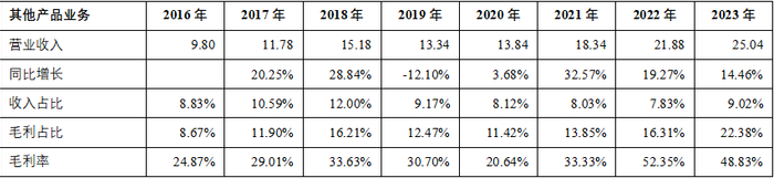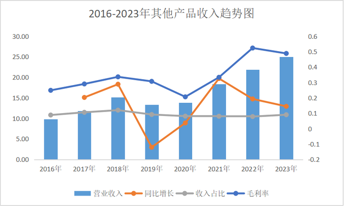 其他产品:石油级黄原胶、药用胶囊、生物有机肥等。从2016年到2023年,其他产品的收入从9.8亿元增长1.56倍至25.04亿元,历史期间涨多跌少。在2023年前两大主营营收下降的情况下,它实现了14.46%的涨幅。2023年它的营收占比虽然只有9.02%,但基于它48.83%的毛利率,毛利占比已达到22.38%。详见下表、图。